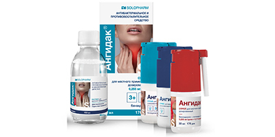 В качестве примера лекарственных средств этой группы можно привести «Ангидак» от компании Solopharm — препарат местного действия на основе бензидамина, который сочетает противовоспалительное, анальгезирующее и антисептическое действие. Он снижает отёк слизистой, уменьшает выраженность боли при глотании.