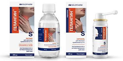 Можно предложить и препараты на основе гексэтидина, например «Гелангин®» от компании Solopharm. Гексэтидин — антисептик широкого спектра действия для лечения инфекций рта и горла. Действующее вещество препарата «Гелангин®» действует сразу на 3 причины боли в горле: бактерии, вирусы и грибы, сохраняет эффект в течение 12 часов и может применяться всего 2 раза в день. Лекарственный препарат представлен двумя основными формами выпуска для лечения заболеваний полости рта и горла: аэрозоль (спрей) и раствор для полоскания.