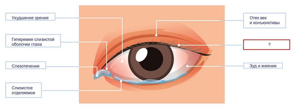 Какой симптом аллергического конъюнктивита пропущен на картинке в одном из прямоугольников?