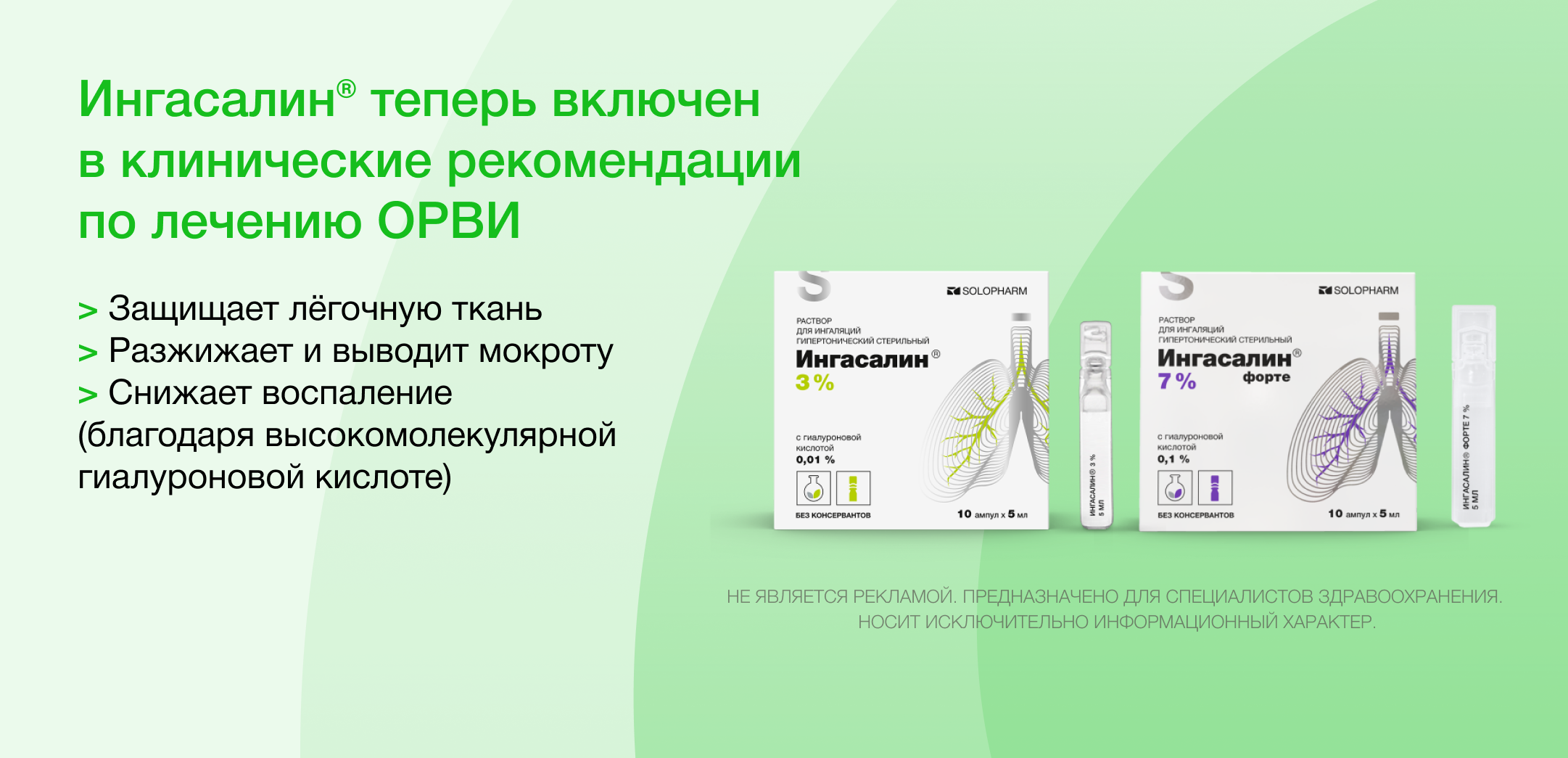 При остром бронхите, который чаще всего вызывают респираторные вирусы, теперь рекомендуется Ингасалин® — гипертонический раствор с гиалуроновой кислотой для ингаляций. Он не просто облегчает кашель, а действует комплексно.